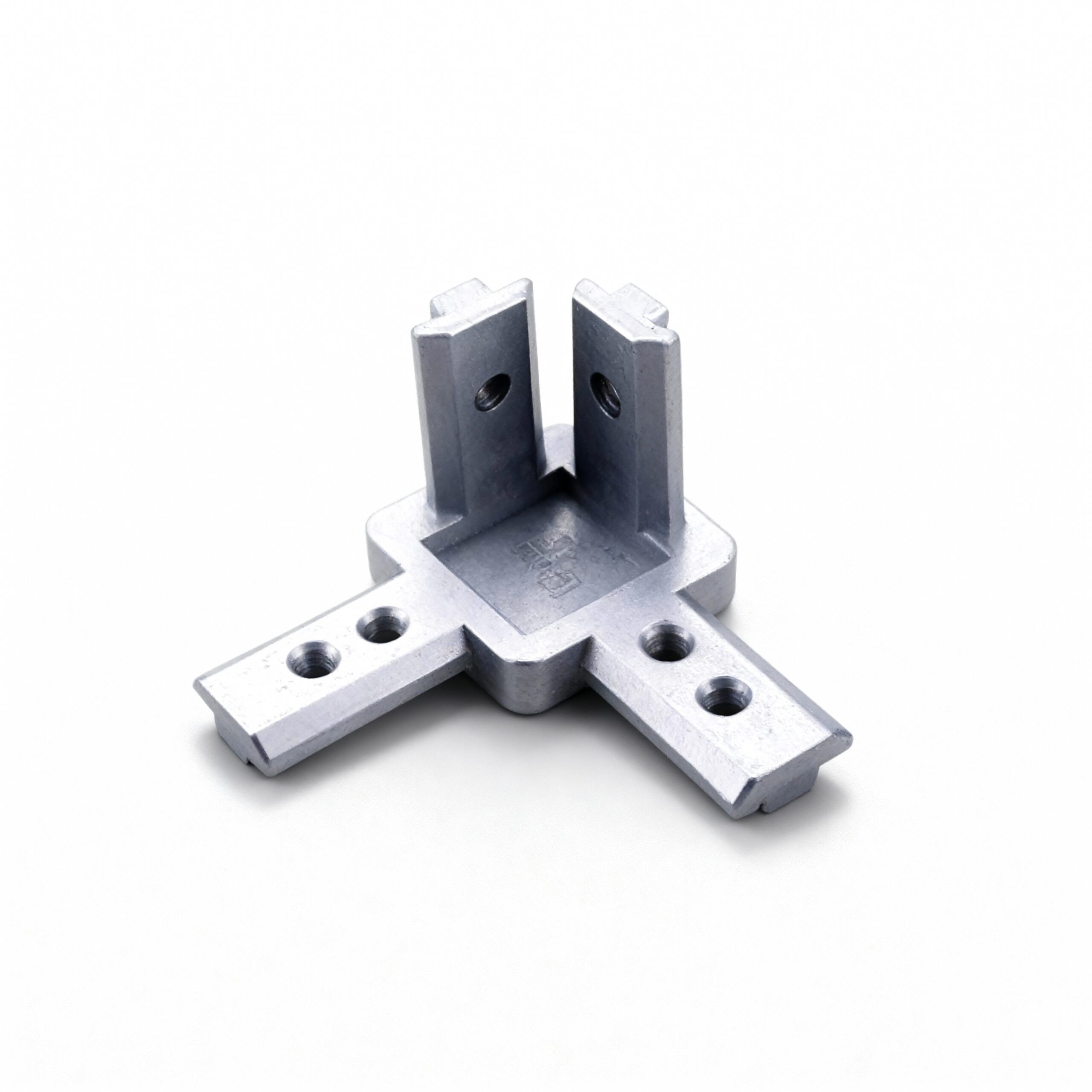 Esquinero tri-conexión para perfiles T-Slot Serie 20, 30 y 40: conector angular multicara para unir tres perfiles en ángulo ortogonal con rigidez y precisión.